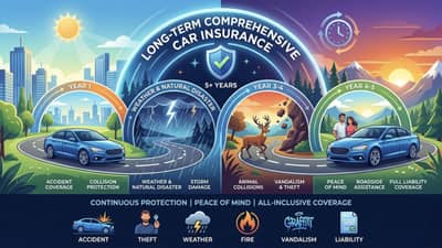 લોન્ગ-ટર્મ કોમ્પ્રીહેન્સિવ કાર ઇન્શ્યોરન્સ એ ઘણા વર્ષોની પોલિસી હોય છે. તેને સામાન્ય રીતે 3 વર્ષ માટે ખરીદી શકાય છે. આમાં થર્ડ-પાર્ટી કવર અને પોતાની ગાડીના નુકસાન (ઓન-ડેમેજ) એમ બંનેનું કવર મળે છે. સામાન્ય 1 વર્ષની પોલિસીથી અલગ, આમાં એકવાર પ્રીમિયમ ભરીને ઘણા વર્ષો સુધી કવર મળે છે અને વારંવાર રિન્યુ કરાવવાની જરૂર પડતી નથી.