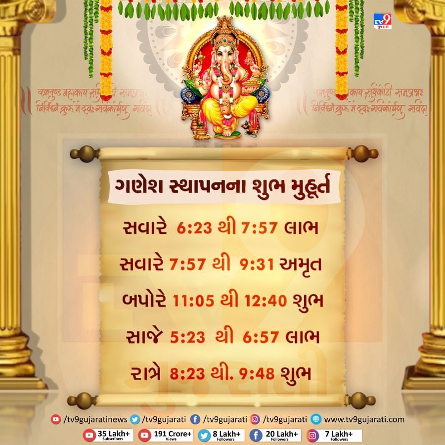 31મી ઓગસ્ટના રોજ ગણેશ ચતુર્થીના દિવસે ગણેશજીની સ્થાપના અને પૂજા માટે દિવસભરમાં કુલ 6 શુભ મુહૂર્ત રહેશે. શ્રેષ્ઠ સમય સવારે 11.20 થી બપોરે 01.20 સુધીનો રહેશે, કારણ કે આ મધ્યાહન સમયગાળો હશે, જેમાં ગણેશજીનો જન્મ થયો હતો.