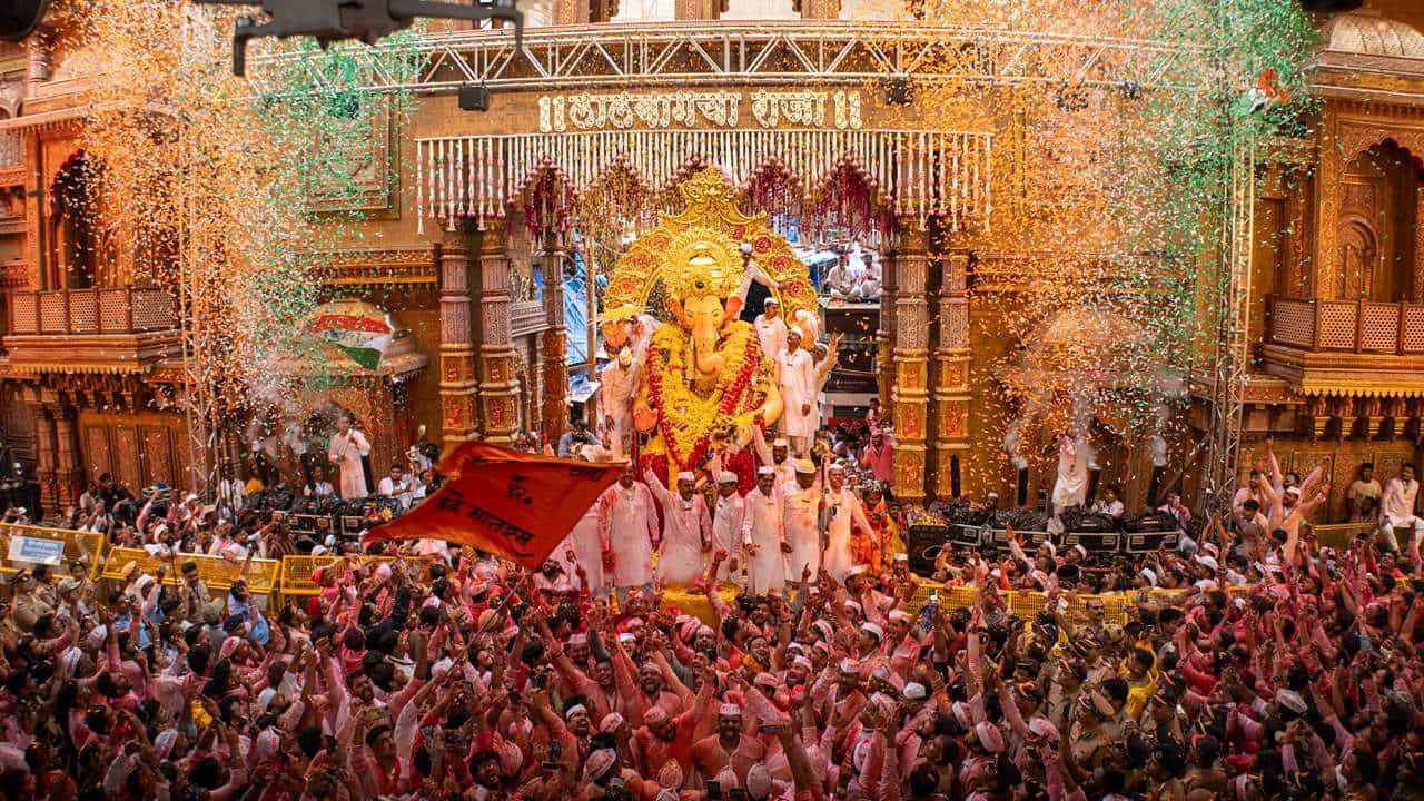 જ્યારે લાલબાગચા રાજાની ભવ્ય મૂર્તિ તેમના મંડપમાંથી બહાર આવે છે, ત્યારે તેને રસ્તાની બાજુમાં આવેલા મુખ્ય દરવાજા પર લોકનૃત્ય, ગીતો અને લગભગ 2 કલાક સુધી ગુલાલની વર્ષા વચ્ચે વિદાય આપવામાં આવે છે.