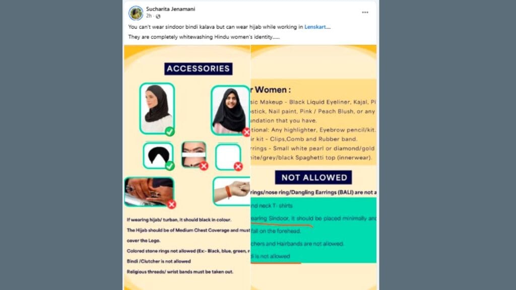 જેમ કે બિંદી, સિંદૂર અને કાંડા પર પહેરવામાં આવતા ધાર્મિક દોરા પર પ્રતિબંધ મૂકવાનો આરોપ છે - જ્યારે તે જ સમયે હિજાબ પહેરવાની મંજૂરી આપી છે. લેન્સકાર્ટના આ હિન્દૂ વિરોધી ડ્રેસ કોડના કારણે હોબાળો મચી ગયો છે.