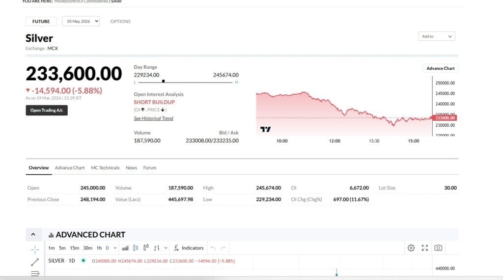 19 માર્ચે ચાંદી ફ્યુચર્સમાં મોટો ઘટાડો જોવા મળ્યો, જેના કારણે ભાવ પ્રતિ કિલોગ્રામ ચાંદી ₹2.33 લાખ સુધી નીચે આવી ગઈ. ક્રૂડ ઓઇલના વધતા ભાવ અને યુએસ ફેડરલ રિઝર્વના આક્રમક વલણને કારણે બજાર પર દબાણ આવ્યું. ટ્રેડિંગ સત્રોમાં નોંધપાત્ર અસ્થિરતા જોવા મળી, જ્યારે બ્રેન્ટ ક્રૂડ $113 ના સ્તરને પાર કરતા બજારની સેન્ટીમેટ વધુ નબળી પડી.