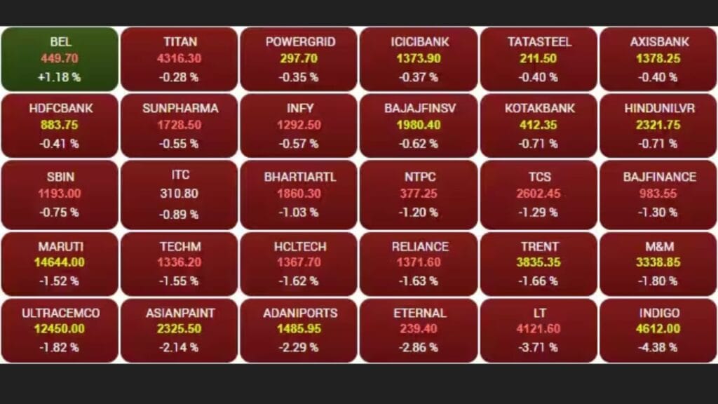 સેન્સેક્સ પર લિસ્ટેડ 30 શેરોમાંથી, ફક્ત એક, BEL, ગ્રીન ઝોનમાં છે. બીજી તરફ, ઇન્ડિગો, L&T અને એટરનલમાં આજે સૌથી તીવ્ર ઘટાડો જોવા મળ્યો. સેન્સેક્સ-લિસ્ટેડ બધા શેરોના નવીનતમ ભાવ નીચે આપેલા છે.