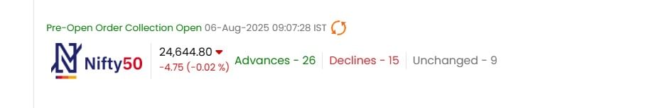 આજના રોજ Nifty 50 ઇન્ડેક્સે ફ્લેટ શરૂઆત થઈ છે. માર્કેટમાં 06 ઓગસ્ટ, 2025ના રોજ સવારે 9:07 સુધીમાં Nifty 50 સૂચકાંક 24,644.80 પર ખુલ્યો હતો, જે 4.75 પોઈન્ટનો નાનો ઘટાડો દર્શાવે છે (માત્ર -0.02%). બજારમાં 26 શેયરોમાં તેજી જોવા મળી છે, જ્યારે 15 શેયરોમાં ઘટાડો નોંધાયો છે અને 9 શેયરો સ્થિર રહ્યા છે. આથી બજારની શરૂઆત નિષ્પક્ષ અને સ્થિર સ્વરૂપે થઈ રહી હોવાનું નિષ્કર્ષ કાઢી શકાય છે. -