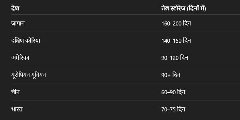 જો યુદ્ધની સ્થિતિમાં તેલનો પુરવઠો બંધ થઈ જાય, તો કયા દેશ પાસે તેના દેશને કેટલા દિવસ ટકાવી રાખવા માટે પૂરતો તેલ સંગ્રહ છે એ જાણીએ તો જાપાન પાસે 160થી 200 દિવસ ચાલે તેટલો સંગ્રહ છે. તેમજ દક્ષિણ કારિયા પાસે 140થી 150 દિવસ ચાલે તેટલુ, આ સિવાય અમેરિકા પાસે 90થી 120 દિવસ ચાલે તેટલો સંગ્રહ છે અને યૂરોપિયન યૂનિયન દેશ પાસ 90 દિવસ કે તેથી વધારે દિવસ ચાલે તેટલું ક્રૂડ ઓઈલ છે. આ સિવાય ચીન પાસ 60થી 90 દિવસ ચાલે એટલું તો ભારત પાસે 70થી 75 દિવસ ચાલે તેટલું ક્રૂડ ઓઈલ છે.