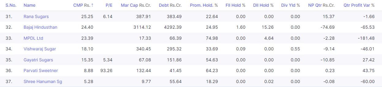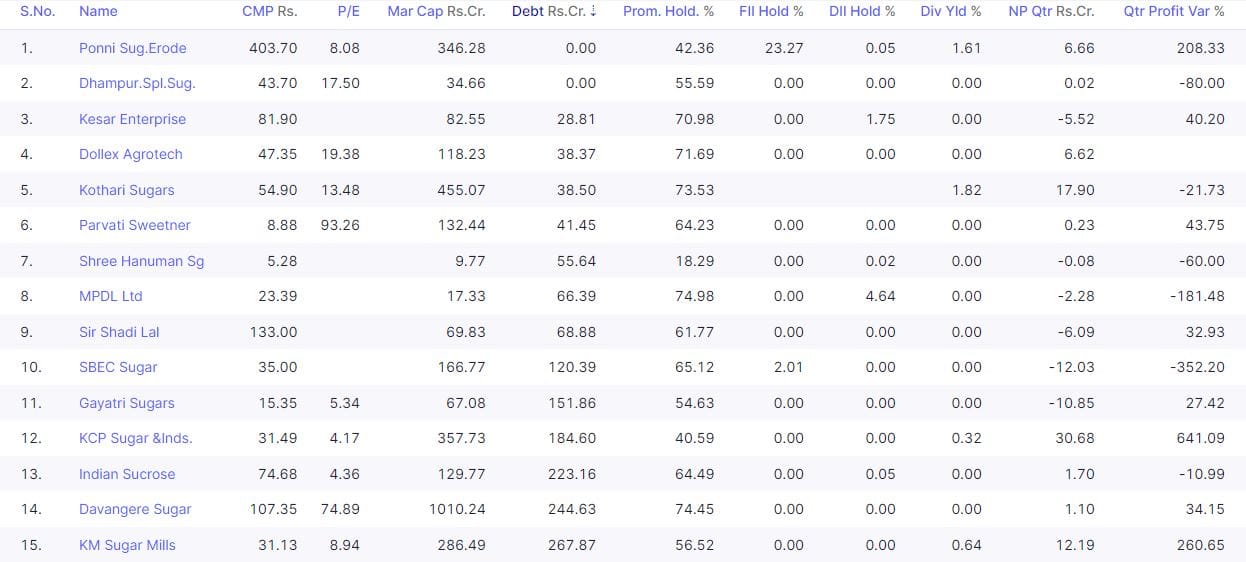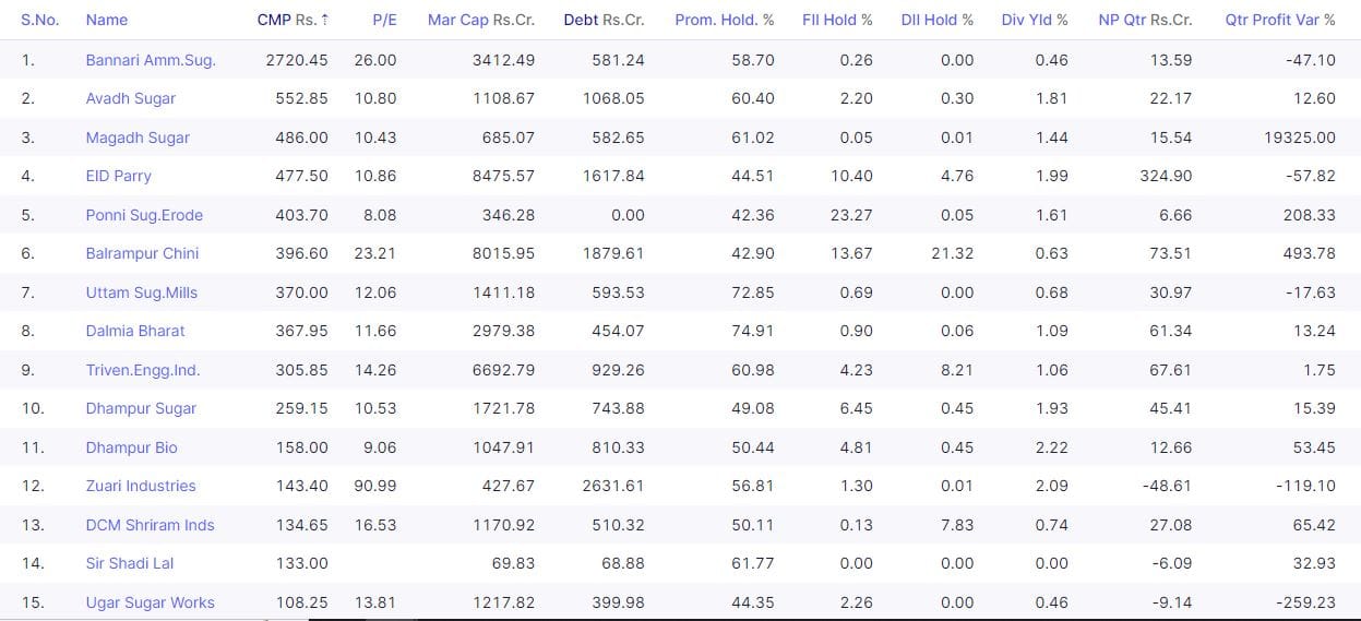 જો સુગર કંપનીની વાત કરવામાં આવે તો Screener વેબસાઈટ મૂજબ કુલ 37 કંપની જોવા મળી રહી છે. જેમાં સૌથી મોંઘો શેરનો ભાવ Bannari Amm.Sug. નો 2720.45 રૂપિયા છે. તેનું માર્કેટ કેપ 3412.49 અને દેવું 581.24 રૂપિયા છે. જો તેના પ્રમોટર હોલ્ડિંગની વાત કરીએ તો 58.70 ટકા છે. આમ આ શેર મલ્ટી બેગર બની ઉંચું વળતર આપી શકે છે.