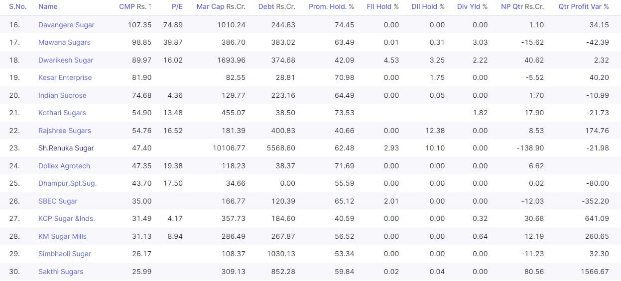 CMP મૂજબ જો ટોપ 10 કંપનીની વાત કરવામાં આવે તો તેમાં Bannari Amm.Sug. બાદ Avadh Sugar-552.85, Magadh Sugar-486.00, EID Parry-477.50, Ponni Sug.Erode-403.70, Balrampur Chini-396.60, Uttam Sug.Mills-370.00, Dalmia Bharat-367.95, Triven.Engg.Ind.-305.85, Dhampur Sugar-259.15.