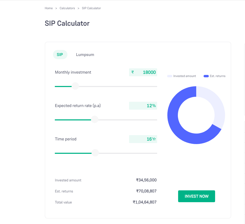 જો કુલ 16 વર્ષ માટે દર મહીને 18 હજાર રુપિયાની SIP કરવામાં આવે તો કુલ રોકાણ 34,56,000 રુપિયા થશે. તેમાં ચક્રવૃદ્ધિ વ્યાજના કારણે 12 ટકા પ્રમાણે અંદાજીત વળતર 70,08,807 રુપિયા થાય છે. તો તેના કારણે કુલ સંપત્તિ 1,04,64,807 રુપિયા બને છે.
