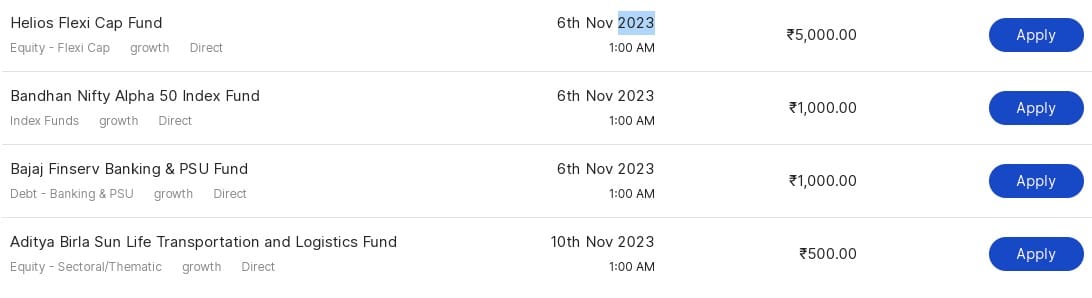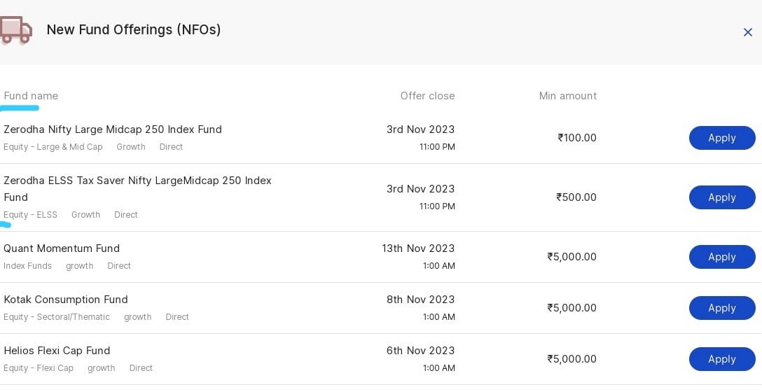 ઝેરોધા ફંડ હાઉસ દ્વારા બે ઇન્ડેક્સ ફંડ્સ લોન્ચ કરવામાં આવ્યા છે. આ બંને ફંડમાં રોકાણ કરવાની છેલ્લી તારીખ 3 નવેમ્બર 2023 છે. ફંડના નામ ઝેરોધા નિફ્ટી લાર્જ મિડકેપ 250 ઇન્ડેક્સ ફંડ અને ઝેરોધા ELSS ટેક્સ સેવર નિફ્ટી લાર્જ મિડકેપ 250 ઇન્ડેક્સ ફંડ છે. મિનિમમ ઈન્વેસ્ટમેન્ટ અનુક્રમે રૂ. 100 અને રૂ. 500 છે.