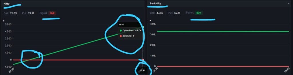 ગ્રાફ સ્પષ્ટપણે દર્શાવે છે કે નિફ્ટીની લીલી રેખા લાલ શૂન્ય રેખાને પાર કરી ગઈ છે અને ઉપર તરફ ગઈ છે, જે તેજીનો ટ્રેન્ડ દર્શાવે છે. વધુમાં, બેંક નિફ્ટીની લીલી રેખા પણ લાલ શૂન્ય રેખાથી ઉપર છે, જેનો અર્થ છે કે બેંક નિફ્ટી પણ તેજીમાં દેખાય છે.