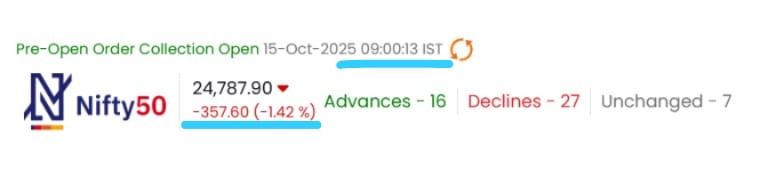 પ્રી-ઓપનિંગના પહેલા 13 સેકન્ડમાં મળેલા નિફ્ટી50ના પ્રારંભિક ડેટાથી સ્પષ્ટ થઈ ગયું છે કે આજે તે કઈ દિશામાં જઈ શકે છે. પ્રથમ 13 સેકન્ડમાં, નિફ્ટી -357.60 પોઈન્ટનો ઘટાડો દર્શાવે છે. જોકે, એ જોવું મહત્વપૂર્ણ રહેશે કે 09:07 મિનિટે પ્રી-ઓપનિંગ કયા સ્તરે સ્થિર થાય છે અને પછી ૦૯:૧૫ વાગ્યે સંપૂર્ણ નિફ્ટી સત્ર કેવી રીતે ખુલે છે.