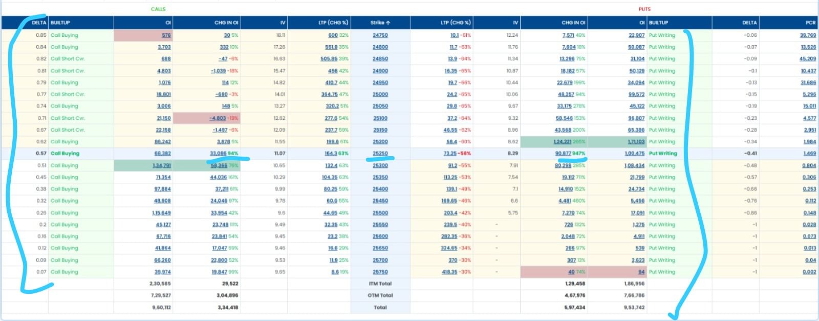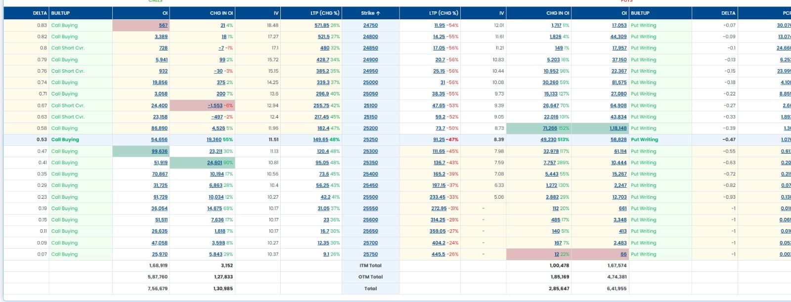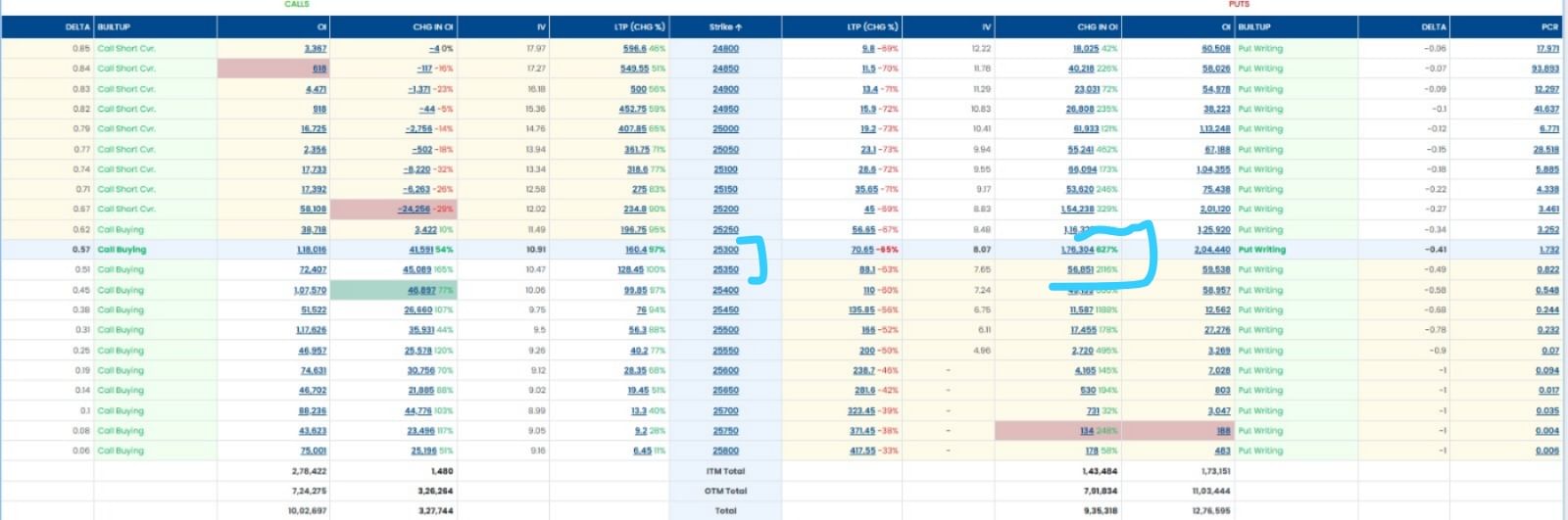 25,350 પર, પુટ રાઈટર્સે સૌથી મજબૂત પોઝિશન બનાવી છે, જે OI માં લગભગ 2000% ફેરફાર છે, જેનો અર્થ એ છે કે તેજીવાળા લોકો કોઈપણ કિંમતે નિફ્ટીને 25350 પર લઈ જશે.