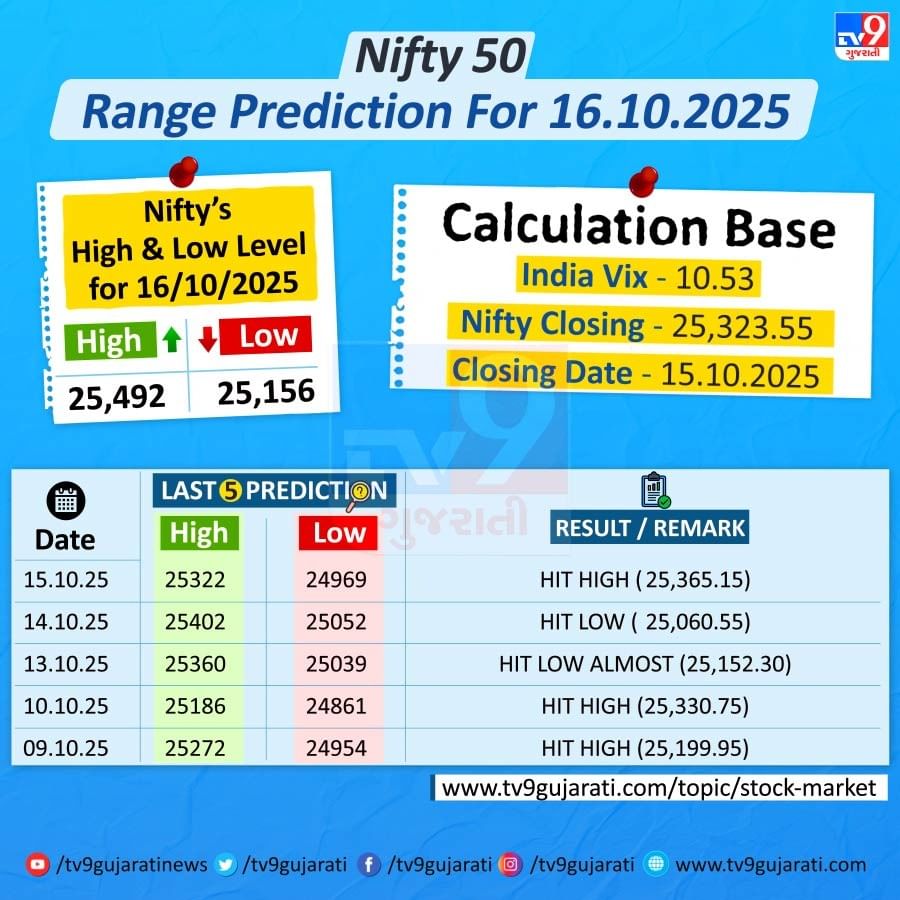 હવે વાત કરીએ, 16 ઓક્ટોબર એટલે કે આવતીકાલના ગુરુવારની તો, નિફ્ટી વધુમાં વધુ 168.45 પોઈન્ટ સાથે 25,492 પર બંધ થશે તેવી શક્યતા છે. બીજીબાજુ જો ઘટાડો થશે તો, નિફ્ટી 25,156 પર જોવા મળશે તેવી સંભાવના છે.