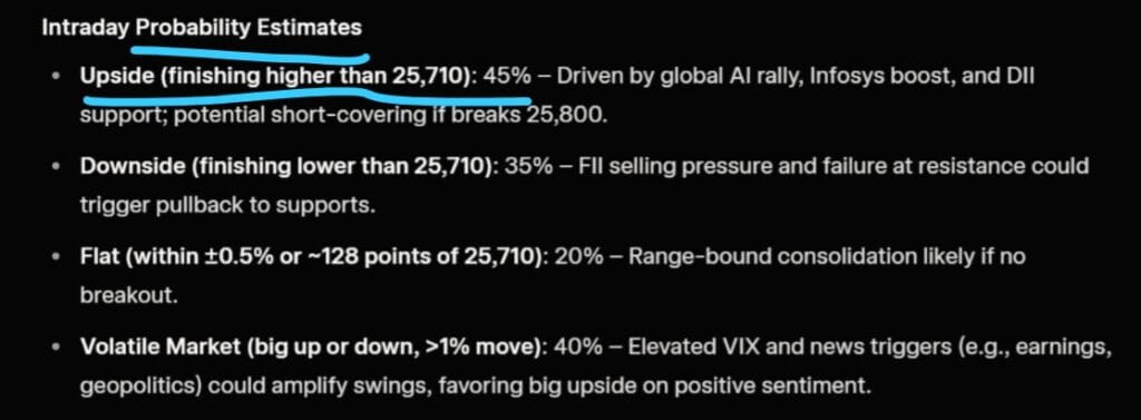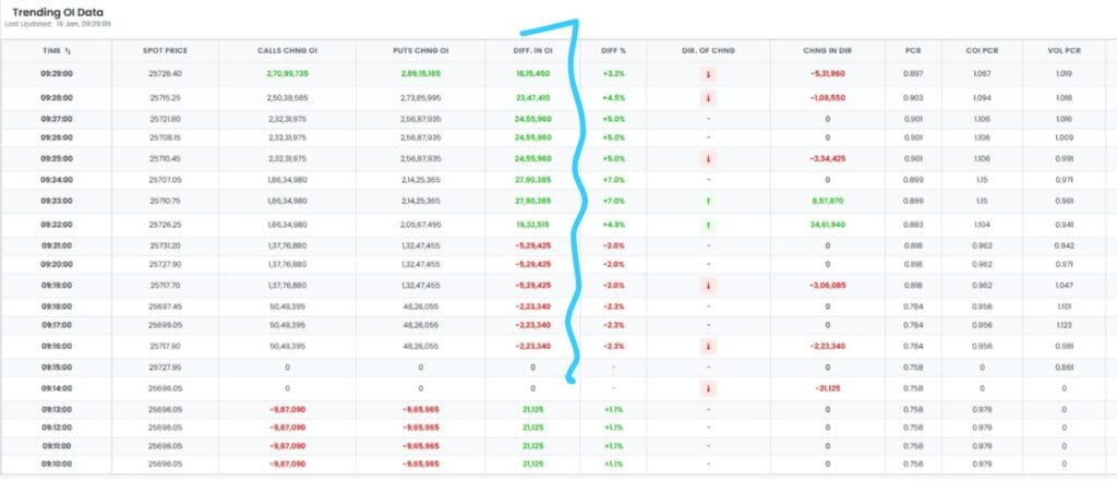 નિફ્ટી 15 મિનિટથી ખુલ્યો છે, પરંતુ નિફ્ટીમાં હજુ સુધી કોઈ વોલ્યુમ જોવા મળ્યું નથી. પરિણામે, OI માં તફાવત બંને દિશામાં 2.5 મિલિયન સુધી પહોંચ્યો નથી. આનો અર્થ એ છે કે મોટા પૈસાવાળા ખેલાડીઓ હાલમાં રાહ જુઓ અને જુઓ મોડમાં છે. BMC ચૂંટણી પરિણામો માટે વલણો સવારે 10 વાગ્યે બહાર આવવાનું શરૂ થશે. શક્ય છે કે મોટા પૈસાવાળા ખેલાડીઓ આ વલણોની રાહ જોઈ રહ્યા હોય, કારણ કે BMC પાસે દેશનું સૌથી મોટું બજેટ છે. લગભગ 40,000 કરોડ રૂપિયા પર, તે દેશનું સૌથી મોટું મ્યુનિસિપલ કોર્પોરેશન છે.