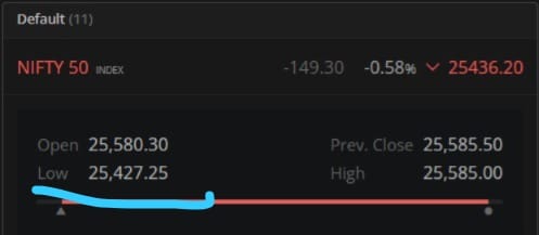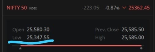 બજાર એક દિવસના નીચા સ્તરે ટ્રેડ થઈ રહ્યો હતો. નિફ્ટી 25,400 થી નીચે લપસી ગયો, નવેમ્બર 2025 પછી પહેલી વાર તે 25,400 થી નીચે ગયો હતો. મિડકેપ ઇન્ડેક્સમાં તીવ્ર ઘટાડો થયો, લગભગ 1200 પોઈન્ટનો ઘટાડો થયો. 50 માંથી 43 નિફ્ટી શેરોમાં વેચવાલી જોવા મળી. મિડકેપ અને સ્મોલકેપ ઇન્ડેક્સ 2% થી વધુ ઘટ્યા.