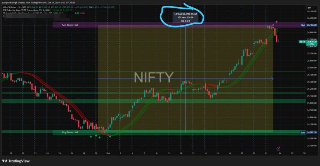છેલ્લા 15 દિવસમાં Nifty 1,500 થી વધુ પોઈન્ટ વધ્યો છે અને હાલમાં તે તેના સર્વકાલીન ઉચ્ચ સ્તર, લગભગ 170 પોઈન્ટ દૂરથી પાછળ ફરી રહ્યો છે. ચાર્ટ પર બનતું પેટર્ન હવે સૂચવે છે કે Nifty અઠવાડિયાના છેલ્લા દિવસે, શુક્રવાર, 24 ઓક્ટોબર, 2025 ના રોજ 25,700 ના દિવસના નીચલા સ્તર (ઇન્ડિયા વિક્સ અને નિફ્ટીના આજે બંધ થવાના આધારે) ને સ્પર્શી શકે છે. આનો અર્થ એ છે કે ઉપરની તરફ ચાલ કરતાં નીચે તરફ ચાલવાની શક્યતા વધુ છે.