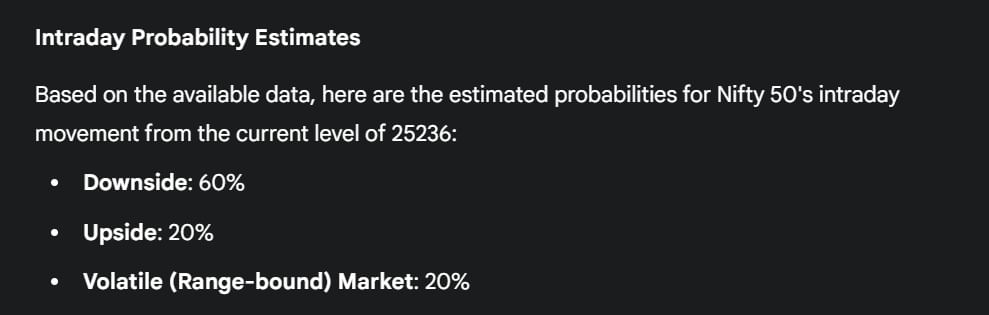 સાપ્તાહિક સમાપ્તિના દિવસે નિફ્ટી સકારાત્મક સંકેતો બતાવી રહ્યું છે. FII એ રોકડમાં વેચાણ કર્યું, પરંતુ ફ્યુચર્સમાં થોડું કવરિંગ હતું. નિફ્ટી ફ્લેટ ટ્રેડ કરી રહ્યો છે. એશિયન બજારો મજબૂત થયા. દરમિયાન, યુએસ સૂચકાંકોમાં નીચા સ્તરોથી સારી રિકવરી જોવા મળી. નાસ્ડેક અને S&P સૂચકાંકો રેકોર્ડ ઊંચાઈએ બંધ થયા.