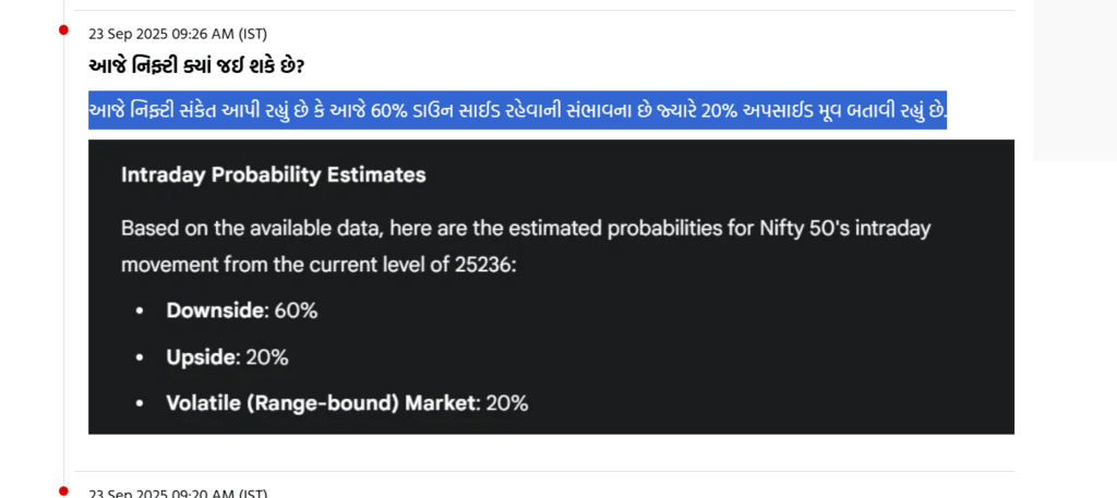 આજે નિફ્ટી સંકેત આપી રહ્યું છે કે આજે 60% ડાઉન સાઈડ રહેવાની સંભાવના છે જ્યારે 20% અપસાઈડ મૂવ બતાવી રહ્યું છે.