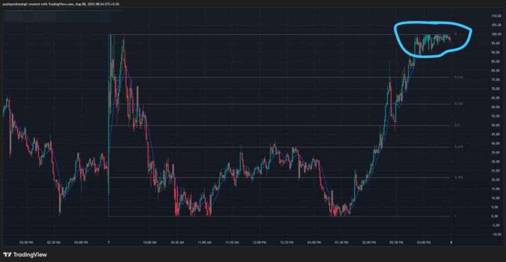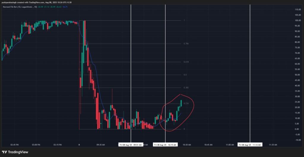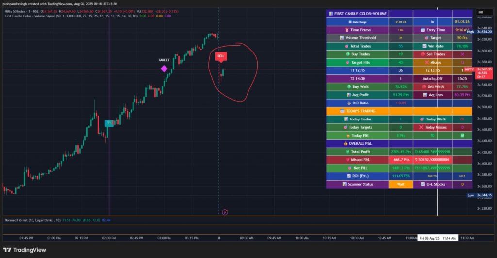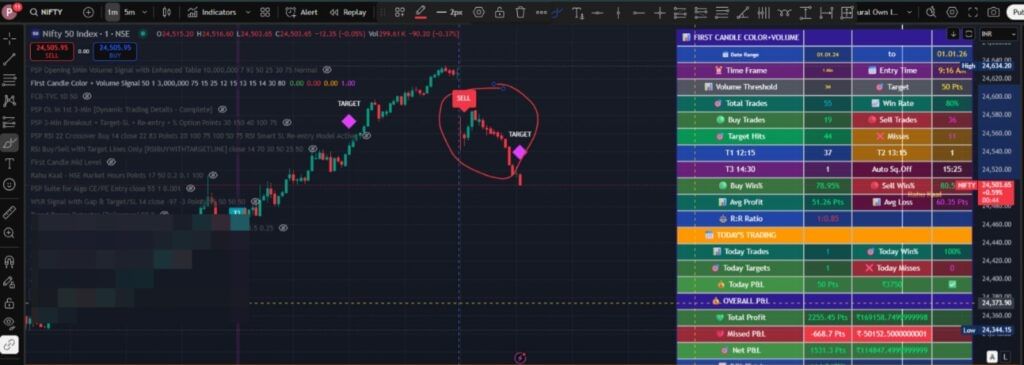 1 મિનિટના ટાઈમફ્રેમ પર દિવસની પહેલી કેન્ડલ પર વેચાણનો સંકેત આવ્યો છે, જેનો અર્થ એ છે કે અહીંથી ભાવ લગભગ 50 થી 75 પોઈન્ટ ઘટવાની શક્યતા છે.