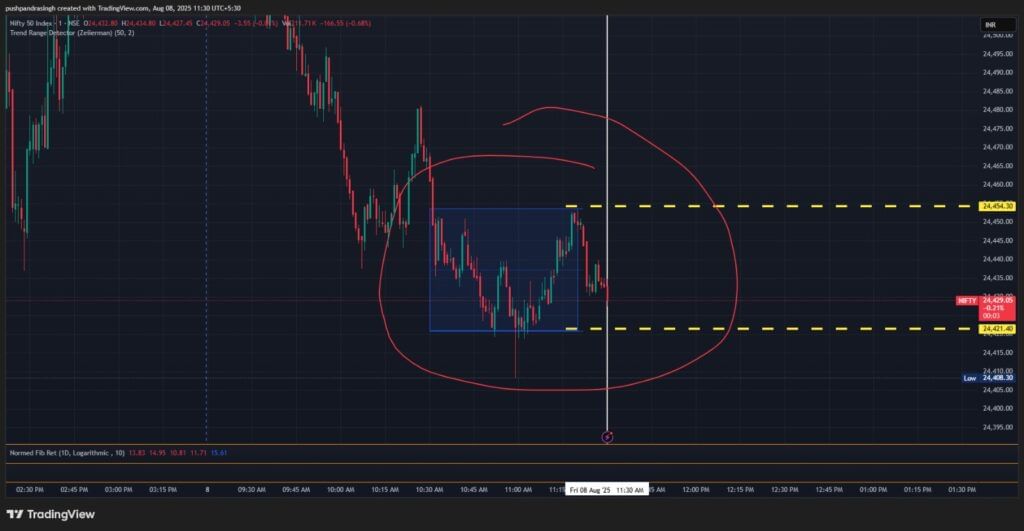 નિફ્ટી હાલમાં કોન્સોલિડેશન તબક્કામાં છે. જ્યાં સુધી તે 24454 અને 24421 ની લાઈન તોડીને આગળ ન વધે ત્યાં સુધી બજારમાં ટ્રેન્ડ બદલાશે નહીં. જોકે, કોન્સોલિડેશન તબક્કો નીચે તરફ જઈ રહ્યો છે એટલે કે લગભગ દિવસનો બોટમ. આવી સ્થિતિમાં, 24454 ના બ્રેકઆઉટ પર, ઉપરની ગતિવિધિ જોઈ શકાય છે. જે લગભગ 12 વાગ્યા પછી આવવાની સંભાવના છે.