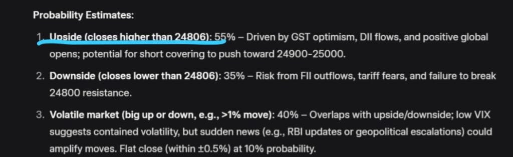 આજે નિફ્ટીની શરુઆત વધારા સાથે થઈ છે ત્યારે અનુમાન લગાવવામાં આવી રહ્યું છે કે આજે માર્કેટ બંધ થતા પણ નિફ્ટી અપ સાઈડ મૂવ સાથે બંધ થશે એટલે કે 24806ની આસપાસ બંધ થવાની શક્યતા છે.