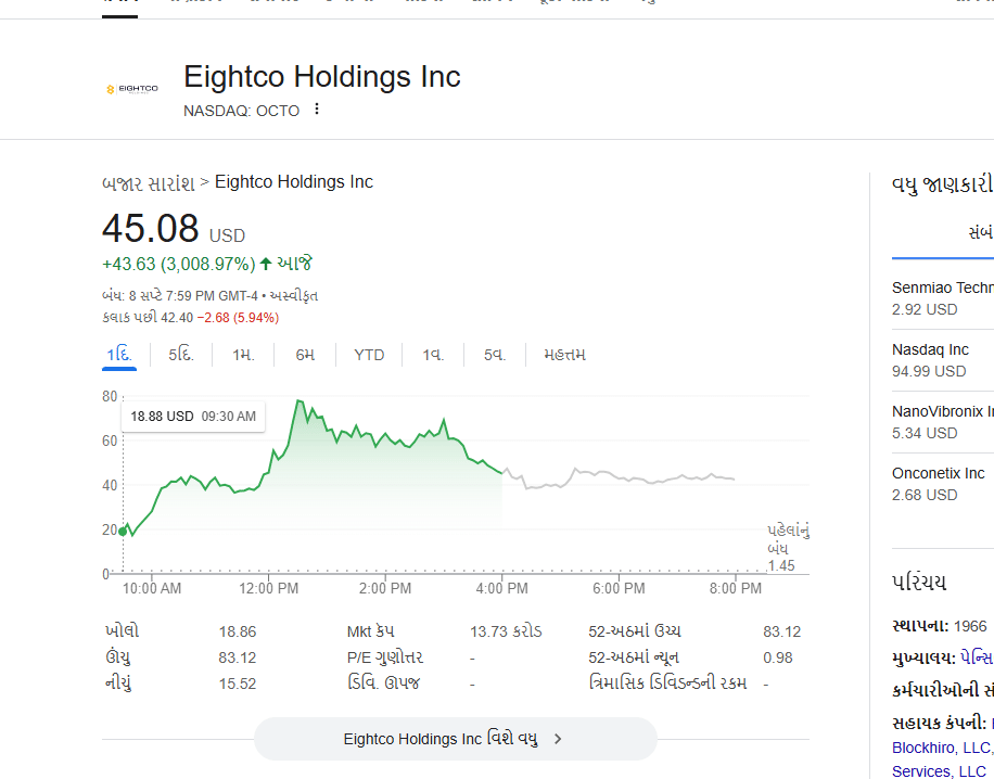 eightco holdingsના શેરમાં 3000%નો ઉછાળો આવ્યો છે. આજે આ શેરમાં 43 રુપિયાનો વધારો જોવા મળ્યો છે. આ શેરનો ક્લોઝિગ $ 1.45માં થયું હતુ જ્યારે આજે યુએસ માર્કેટ ખુલતા જ શેર $18.86 પર પહોંચ્યો હતો. તેમજ તેનું આજે યુએસ માર્કેટમાં ક્લોઝિંગ $45.08 થયું છે.