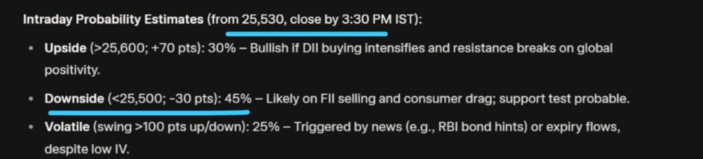 વધુમાં, નિફ્ટી 25486 ની નીચી સપાટીએ પહોંચી ગયો છે, અને ઇન્ડિયા વિક્સ-આધારિત નીચી સપાટી 25455 છે, જેનો અર્થ છે કે વધુ ઘટાડા માટે કોઈ જગ્યા નથી. તેથી, વધુ નીચે જવા પર શરત લગાવવાને બદલે, તળિયે ખરીદીની રાહ જુઓ.
