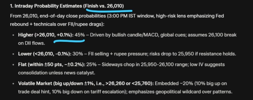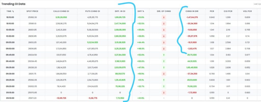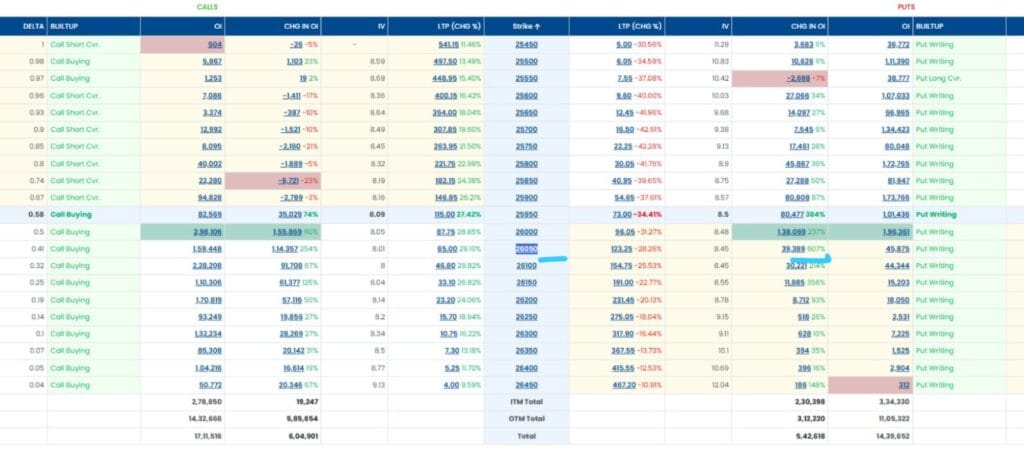 રાત્રે 10:13 વાગ્યે, એવું અહેવાલ આવ્યું કે બુલ્સ તેમની પકડ ગુમાવી રહ્યા છે અને બજાર બેયરના હાથમાં જવાની તૈયારીમાં છે. 26050 પર OI માં તફાવત, જે અગાઉ 1100% થી વધુ હતો, તે ફક્ત 15 મિનિટમાં ઘટીને 600% થઈ ગયો, અને આ નિફ્ટીના ઘટાડામાં સીધો પ્રતિબિંબિત થયો.