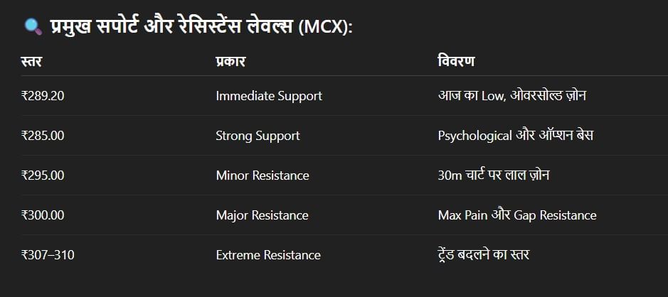 OI અને ટેકનિકલ ડેટાને જોડીને, તે સ્પષ્ટ છે કે કુદરતી ગેસ હાલમાં ડાઉનટ્રેન્ડમાં છે. બજાર ₹289–₹285 ના સ્તરે ઘટી શકે છે, ઉછાળો ₹295–₹297 સુધી મર્યાદિત છે, સિવાય કે ₹301 થી ઉપર નિર્ણાયક બ્રેકઆઉટ થાય.