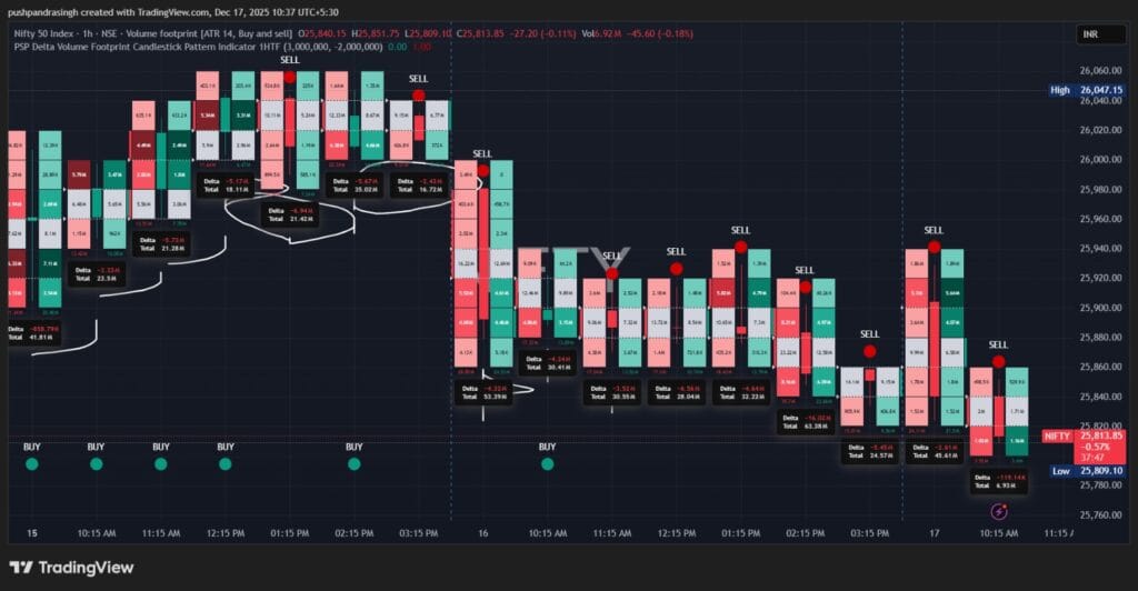પીએસપી ડેલ્ટા વોલ્યુમ ફૂટપ્રિન્ટ કેન્ડલસ્ટિક સૂચક પર નજીકથી નજર નાખવાથી બજારની નબળાઈ સ્પષ્ટપણે દેખાય છે. દરેક કલાકદીઠ મીણબત્તીનો ડેલ્ટા નકારાત્મક છે. આનો અર્થ એ છે કે છેલ્લા ત્રણ દિવસથી રીંછ નિફ્ટી પર પ્રભુત્વ ધરાવે છે. જ્યારે પણ નિફ્ટી વધ્યો છે, ત્યારે તે નબળી તેજી રહી છે કારણ કે ઊંચા સ્તરે, રીંછ નીચા ભાવે શોર્ટ સેલિંગમાં રોકાયેલા છે. પરિણામે, નિફ્ટી છેલ્લા બે દિવસથી ડાઉનટ્રેન્ડમાં છે. જ્યાં સુધી આ સૂચક સતત ત્રણ મીણબત્તીઓ પર ગ્રીન ડેલ્ટા ન બનાવે, ત્યાં સુધી નિફ્ટી મજબૂત ઉપરની તરફ આગળ વધે તેવી શક્યતા નથી.