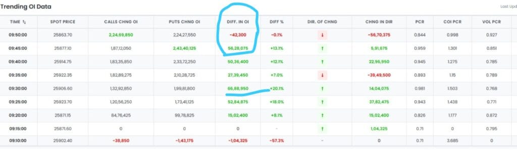 OI (તેલ કિંમત) માં તફાવત નિફ્ટીને સ્પષ્ટ દિશા આપી રહ્યો નથી. 6.6 મિલિયનના પોઝિટિવ સ્તર પર પહોંચ્યા પછી, તેમાં ઘટાડો થયો, અને હવે, 9:50 વાગ્યે, તે અચાનક 5.6 મિલિયનના પોઝિટિવ સ્તરથી 42,000ના નકારાત્મક સ્તર પર ગયો. આ પણ એક જાળ છે.