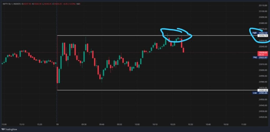 દિવસના ઊંચા સ્તર 25050 ની આસપાસ હોવાથી ફરીથી અસ્વીકાર આવ્યો છે કારણ કે ત્યાં મોટો પ્રતિકાર છે.