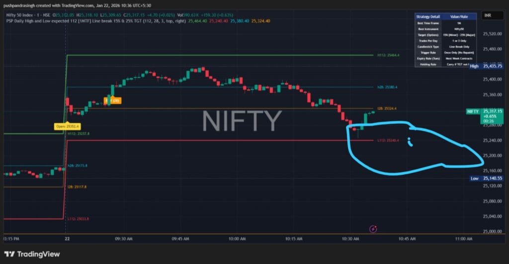 PSP ડેઇલી HIgh અને લો એક્સપેક્ટેડ 112 સૂચક અનુસાર, આજના અપેક્ષિત નીચા સ્તરે 25240 હતો, અને નિફ્ટી 25245 થી પાછો ઉછળ્યો છે. આનો અર્થ એ કે દિવસનો નીચો કદાચ પહેલાથી જ સેટ થઈ ગયો છે.