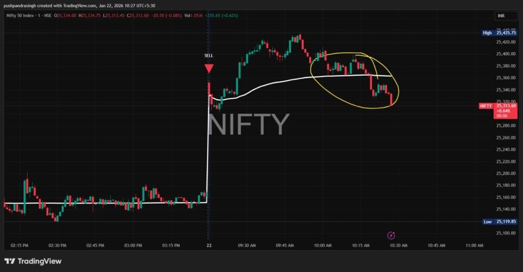 નિફ્ટી ઇન્ટ્રાડે જોખમી નિશાન પર પહોંચી ગયો છે. જો નિફ્ટી 11:30 અથવા 11:45 વાગ્યે REd 0 રેખાને પાર કરે છે અને નીચે જાય છે, તો નિફ્ટી 50 થી 100 પોઈન્ટ વધુ ઘટી શકે છે.