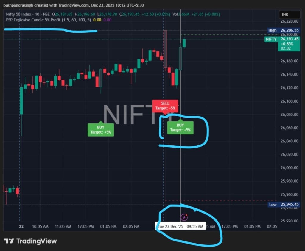 નવા સૂચક, PSP એક્સપ્લોઝિવ કેન્ડલ 5% નફાએ, 9:55 અને 10:00 વચ્ચેના પાંચ મિનિટના સમયગાળામાં નિફ્ટીની દિશા પરિવર્તનને સંપૂર્ણ રીતે કેદ કર્યું, જેનાથી ચાર્ટ પર ખરીદીનો સંકેત મળ્યો.