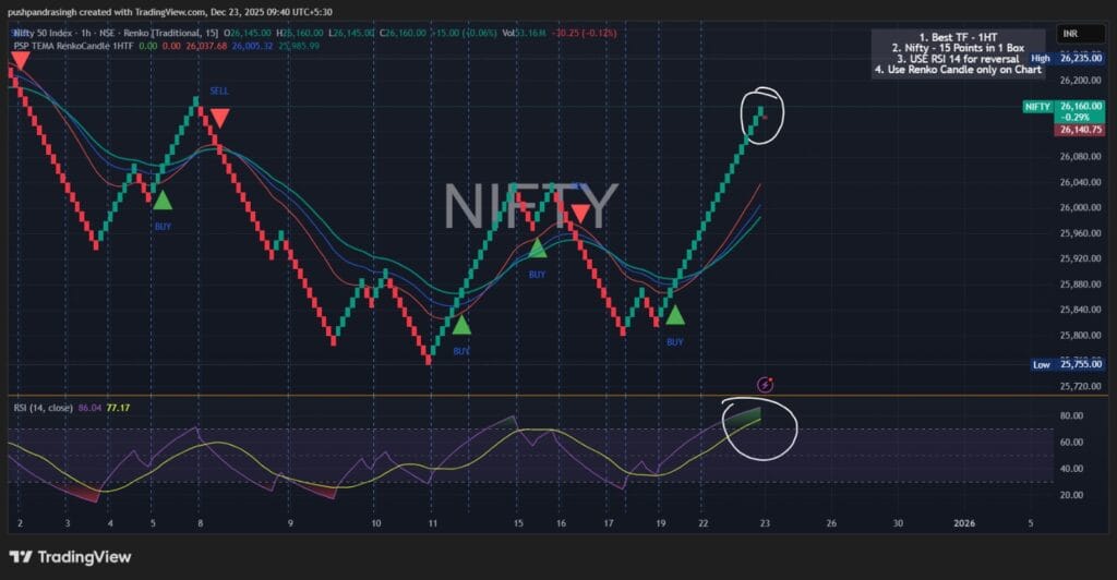 ALert – PSP TEMA Renko Candle Indicator પર PSP TEMA રેન્કો કેન્ડલ સૂચક પર લાલ કેન્ડલ બનવા લાગી છે, અને RSI પણ ઓવરબૉટ ઝોનમાં પ્રવેશી ગયો છે. અહીંથી નુકસાનની સંભાવના વધારે છે. તેથી, સાવધાની સાથે વેપાર કરો.