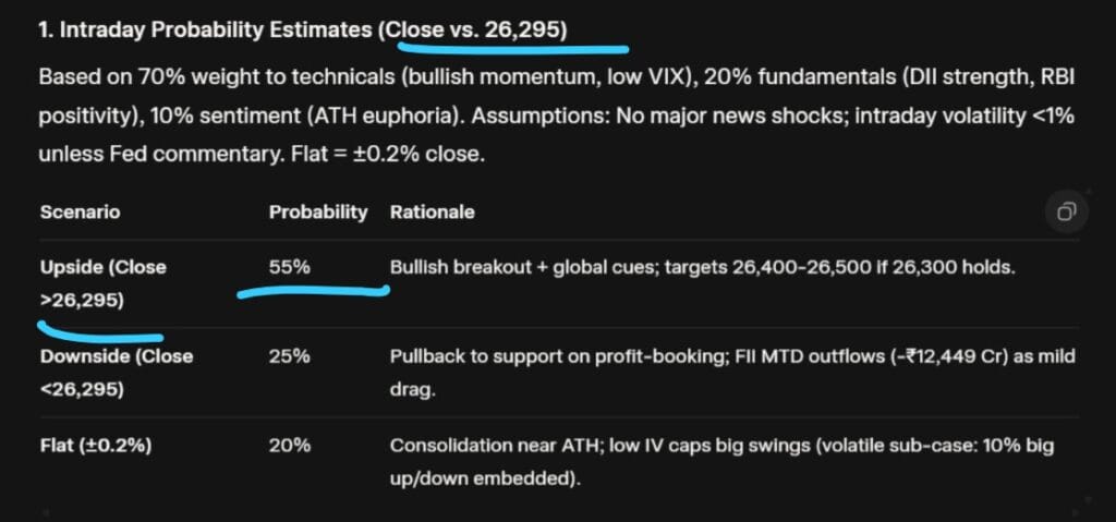 આજે બજાર નવી ઊંચાઈના સંકેતો બતાવી રહ્યું છે. GIFT નિફ્ટી 26400 ને પાર કરી ગયો છે. વૈશ્વિક બજારમાંથી પણ સારો ટેકો મળી રહ્યો છે. એશિયા ઊંચે ટ્રેડ કરી રહ્યું છે. સતત ચોથા દિવસે યુએસ બજારોમાં તેજી જોવા મળી રહી છે. DOW JONES 300 થી વધુ પોઈન્ટનો વધારો દર્શાવે છે.