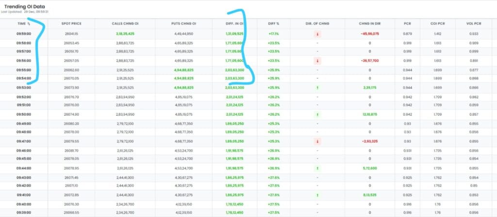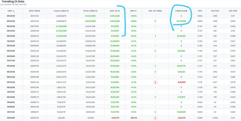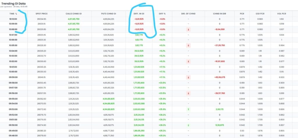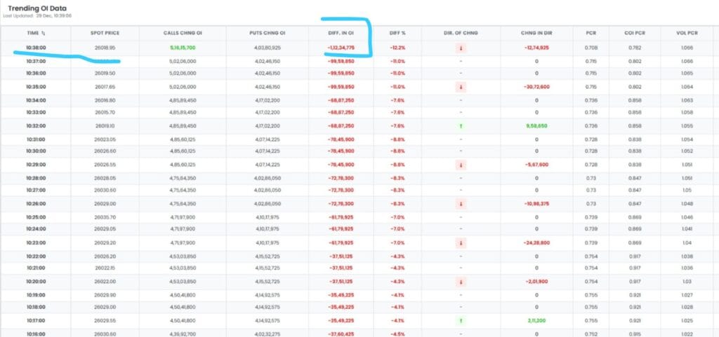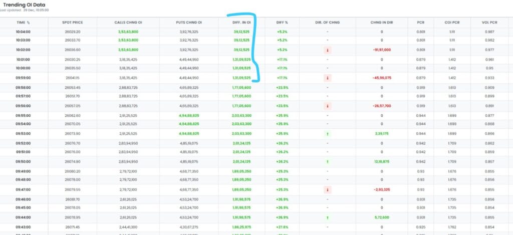 દિવસનો પહેલો ટ્રેપ પૂર્ણ થયો. બેયર્સે શરૂઆતમાં નિફ્ટીને તેજીનો અંદાજ લગાવ્યો હતો, પરંતુ પછી અચાનક, 9:55 અને 10:10 વચ્ચેના 15 મિનિટમાં, નિફ્ટી મંદીનો થઈ ગયો. આજે પહેલી વાર OI માં તફાવત નકારાત્મક બન્યો.