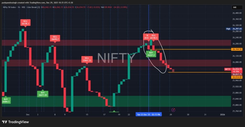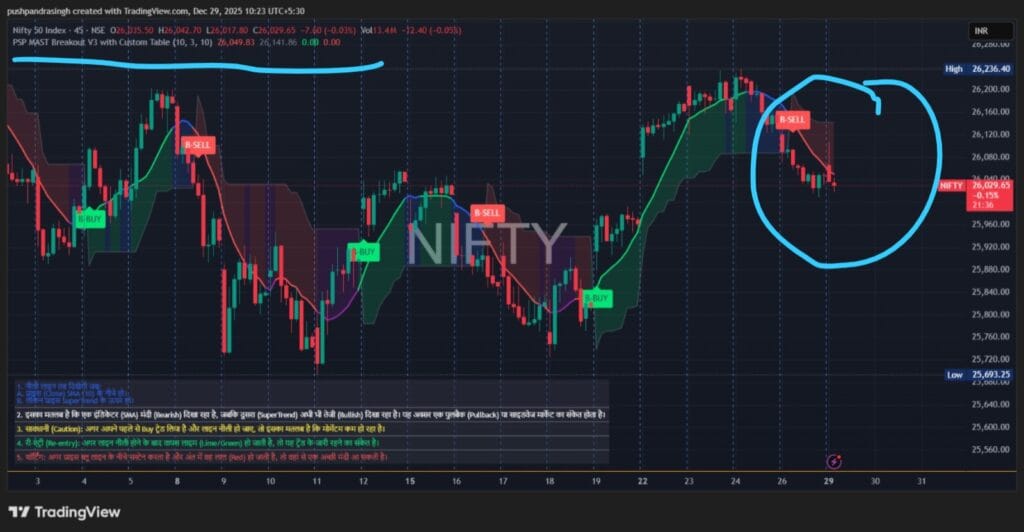 મંગળવાર, 23 ડિસેમ્બર, 2025 ના રોજ, PSP NURI LINE BREAK સૂચકે વેચાણ બાજુનો સંકેત આપ્યો, જે 26164.55 ના વેચાણ સ્તર પર પહોંચ્યો. અમે આગાહી કરી હતી કે નિફ્ટી આ સ્તરથી 100 થી 200 પોઈન્ટનો ઘટાડો જોઈ શકે છે. ગુરુવારે ક્રિસમસની રજા પછી, નિફ્ટી શુક્રવારે ખુલ્યો અને સોમવારે 150 પોઈન્ટના લક્ષ્યને સ્પર્શ્યો.