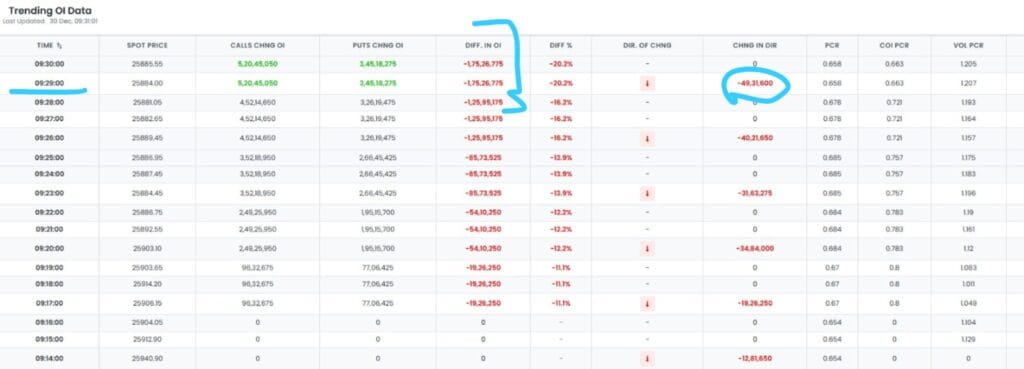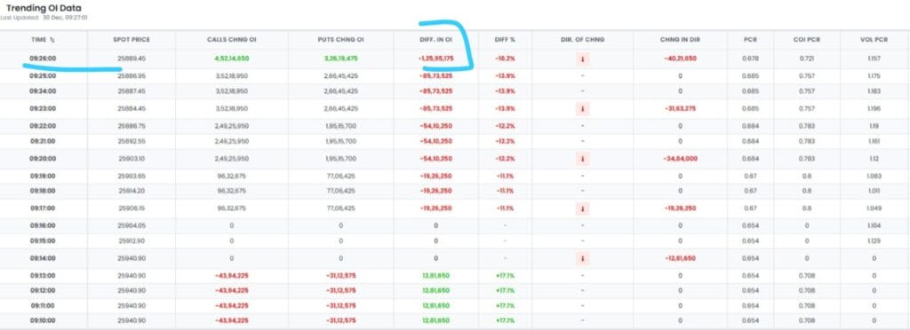 સવારે 9:29 વાગ્યે, માત્ર એક મિનિટમાં, OI માં 49,31,000 નો નકારાત્મક ફેરફાર ઉમેરવામાં આવ્યો, જેનો અર્થ એ છે કે દિવસના પહેલા ભાગમાં નિફ્ટીમાં 100 થી 150 પોઈન્ટનો ઝડપથી ઘટાડો થવાની સંભાવના છે.