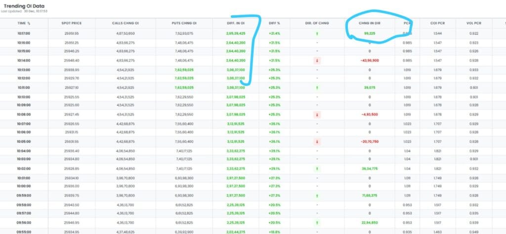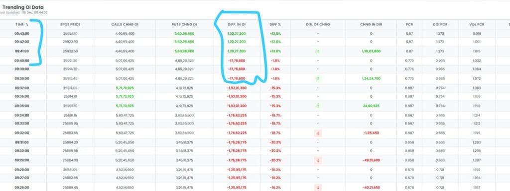 ટ્રેન્ડિંગ OI ડેટામાં OI માં તફાવત: નિફ્ટી ખુલ્યાના 11 મિનિટની અંદર, નિફ્ટી નકારાત્મક 1.25 કરોડને પાર કરી ગયો, જે નિફ્ટી મંદી તરફ વળવાનો સ્પષ્ટ સંકેત છે.