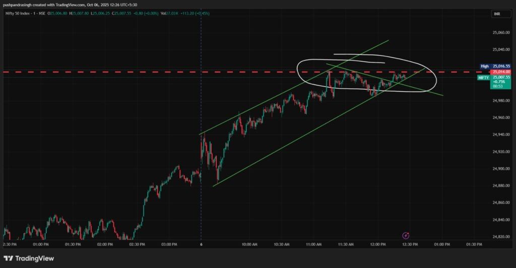 નિફ્ટી તેની 52-સપ્તાહની ઊંચી સપાટી તોડવાનો પ્રયાસ કરી રહ્યો છે. તેણે છેલ્લા એક કલાકના ક્વાર્ટરમાં 5-6 વખત તેને તોડવાનો પ્રયાસ કર્યો છે. જો નિફ્ટી આજે તેની 52-સપ્તાહની ઊંચી સપાટી તોડે છે અને પછી થોડા સમય માટે 25014 ને પાર કરે છે, તો આગામી થોડા દિવસો માટે બજાર અહીંથી સંપૂર્ણપણે તેજીમાં આવી જશે.