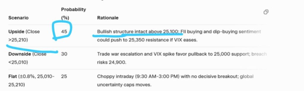 આજે સવારે અમે અનુમાન લગાવ્યું હતુ કે આજે નિફ્ટી કઈ દિશામાં રહી શકે છે ત્યારે આજે અમે કહ્યું હતુ કે નિફ્ટી આજે માર્કેટ બંધ થતા 25210થી ઉપર રહી શકે છે ત્યારે નિફ્ટી 25,227 પર બંધ થયો છે.