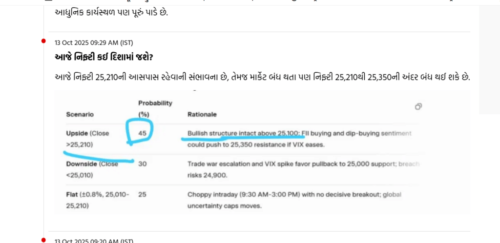 જોકે, એ જોવું મહત્વપૂર્ણ રહેશે કે પ્રી-ઓપનિંગ 9:07 મિનિટે કયા સ્તરે સ્થિર થાય છે અને પછી 9:15 વાગ્યે સંપૂર્ણ Nifty સત્ર કેવી રીતે ખુલે છે.