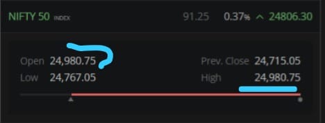 આજના દિવસનો અડધો ભાગ પસાર થઈ ગયો છે અને નિફ્ટીનો ખુલ્લો અને નીચો ભાવ સમાન છે એટલે કે Open=Low. આનો અર્થ એ છે કે નિફ્ટી આજે આ ભાવે પાછો આવશે નહીં અને નીચો રહેશે.
