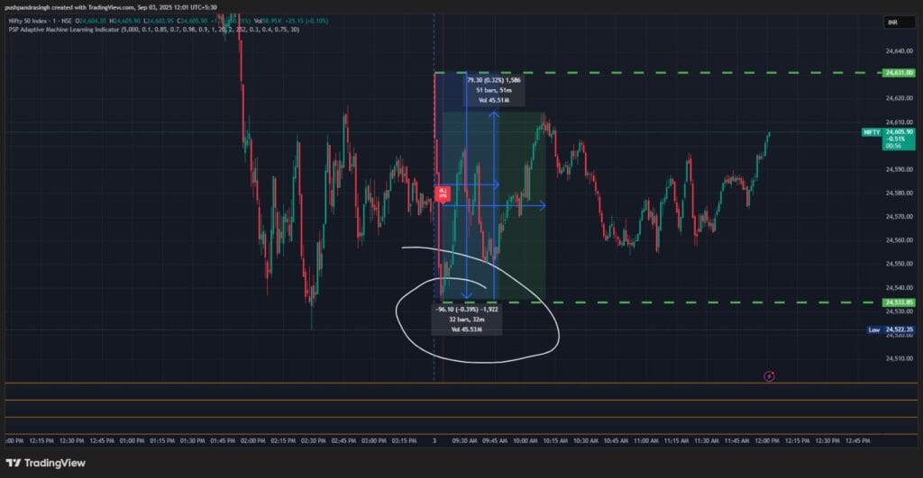 આજે સવારથી નિફ્ટી 96 પોઈન્ટની રેન્જમાં ટ્રેડ થઈ રહ્યો છે. આજે 1 મિનિટના સમયમર્યાદામાં તે દિવસના પ્રથમ કેન્ડલના ઊંચા કે નીચલા સ્તરને તોડી શક્યો નથી.