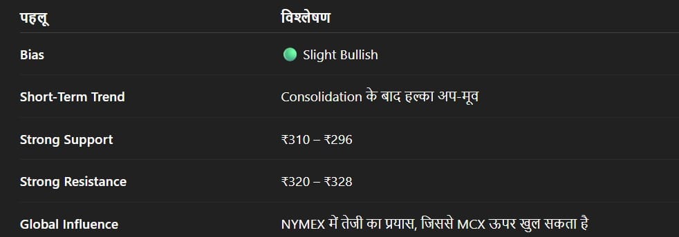 જો MCX ₹314 થી ઉપર ટકી રહે છે, તો ₹318–₹320 સુધીની તેજી શક્ય છે. સ્ટોપલોસ ₹310 થી નીચે રાખો. બીજી બાજુ, જો ₹320–₹322 ને પાર કરવામાં આવે તો તેજી વધુ તીવ્ર બની શકે છે.