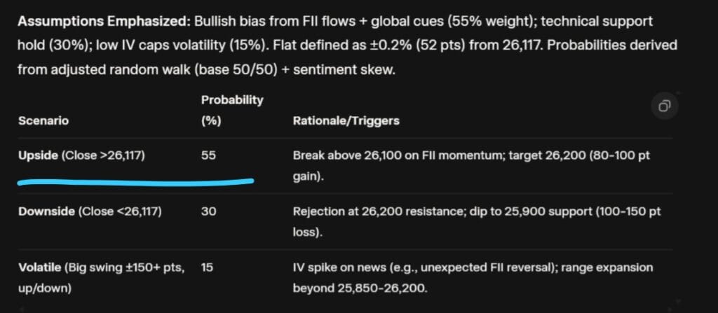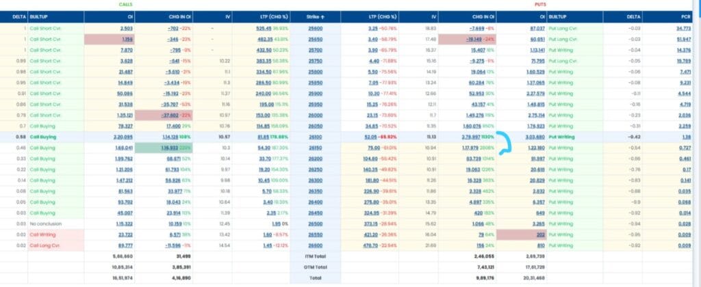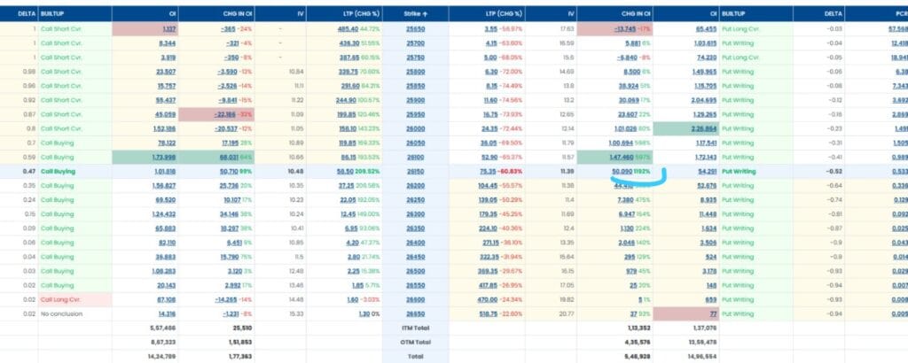 26150 ના પુટ સાઇડ પર OI તફાવતમાં 1192% નો ફેરફાર બજાર ખુલ્યાના પહેલા 15 મિનિટમાં થયો હતો, જે દર્શાવે છે કે નિફ્ટી આગામી એક કે બે કલાક સુધી આ સ્તરે ખૂબ જ મજબૂત રહેશે.