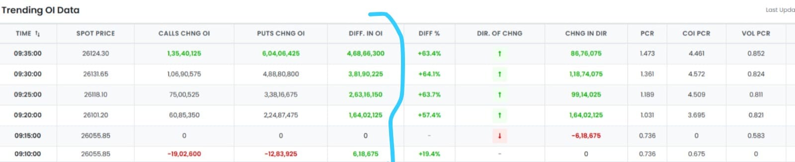 OI માં ડિફરેન્સ સતત હકારાત્મક દિશામાં વધી રહ્યો છે, એટલે કે નિફ્ટી તેજીની સ્થિતિમાં મજબૂતાઈ મેળવી રહ્યો છે.