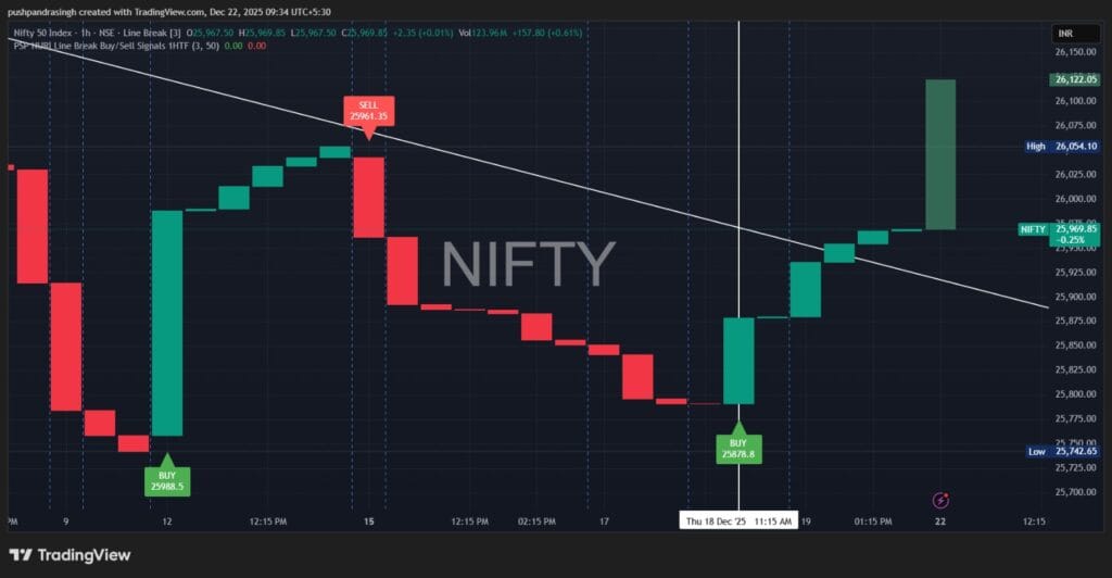 ગુરુવારે, સવારે લગભગ 11:30 વાગ્યે, PSP નુરી લાઈન બ્રેક સૂચકે ખરીદીનો સંકેત દર્શાવ્યો, જે 25878 ના પ્રવેશ બિંદુનો સંકેત આપે છે. વિશ્લેષણ મુજબ, નિફ્ટી આગામી એક કે બે દિવસમાં આ સ્તરથી 150-250 પોઈન્ટ વધી શકે છે. આજે સોમવાર છે, અને નિફ્ટી પહેલાથી જ આ સ્તરથી 257 પોઈન્ટ વધી ચૂક્યો છે.