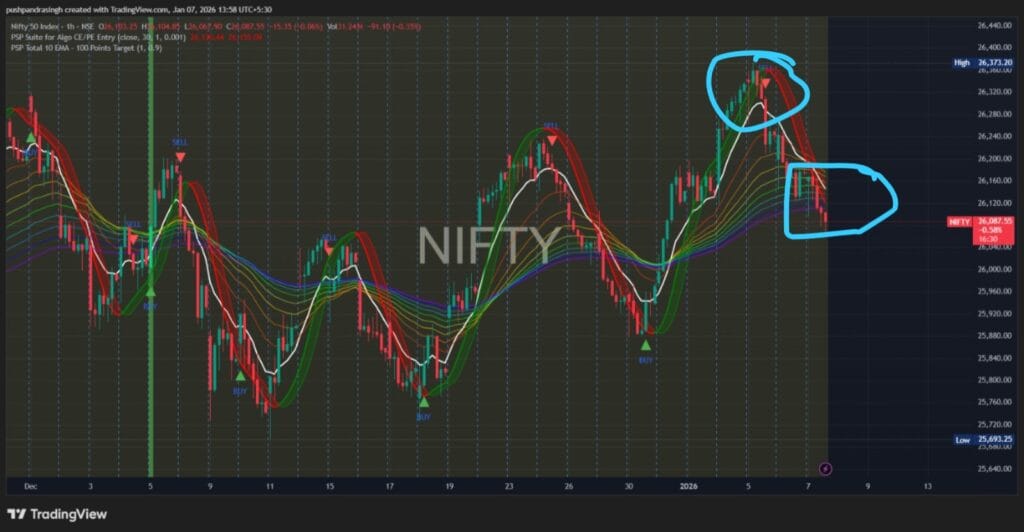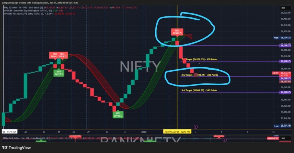 આ ઈન્ડિકેટરે સોમવારે બપોરે 12:15 વાગ્યે 26308 પર સેલ સિગ્નલ જારી કર્યો હતો. ત્યારથી તે 212 પોઈન્ટ નીચે સુધારેલ છે. ત્રીજો ટાર્ગેટ 26008 છે, જોકે 26050 પર મજબૂત સપોર્ટ દેખાઈ રહ્યો છે.